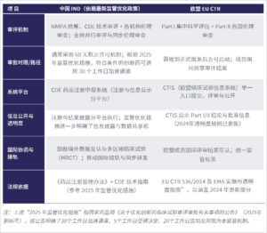 为更直观地理解两种体系在审评机制、时限与监管导向方面的差异,以下表格总结了中国 IND(结合 2025 年监管优化措施)与欧盟 EU CTR 的关键特点对比